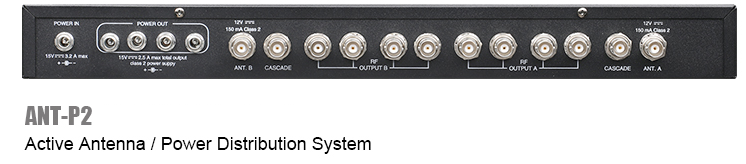 ANT-P2 is the UHF antenna distribution system with compensate function. When used with a pair of external receiving antenna, this can offer at most 4 pairs of eight- way radio-frequency signal output and one pair of two-way cascade radio-frequency signal output. Antenna input connector can provide 15V 250mA DC bias, and with current overload protection function.