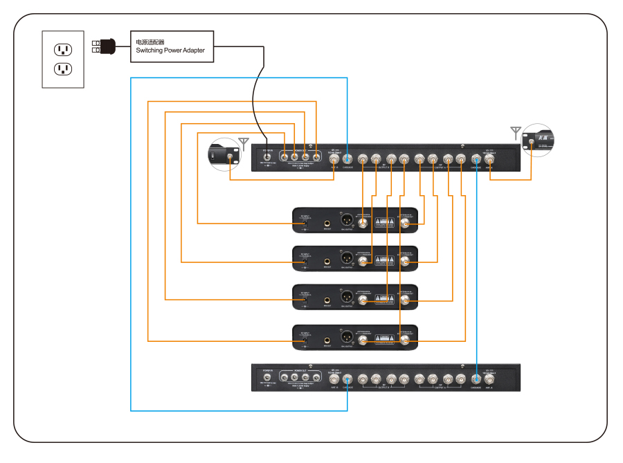 | Antenna Distribution: | Two groups of active one to four allocation outputs and two groups of active adjustable one to one cascaded outputs |