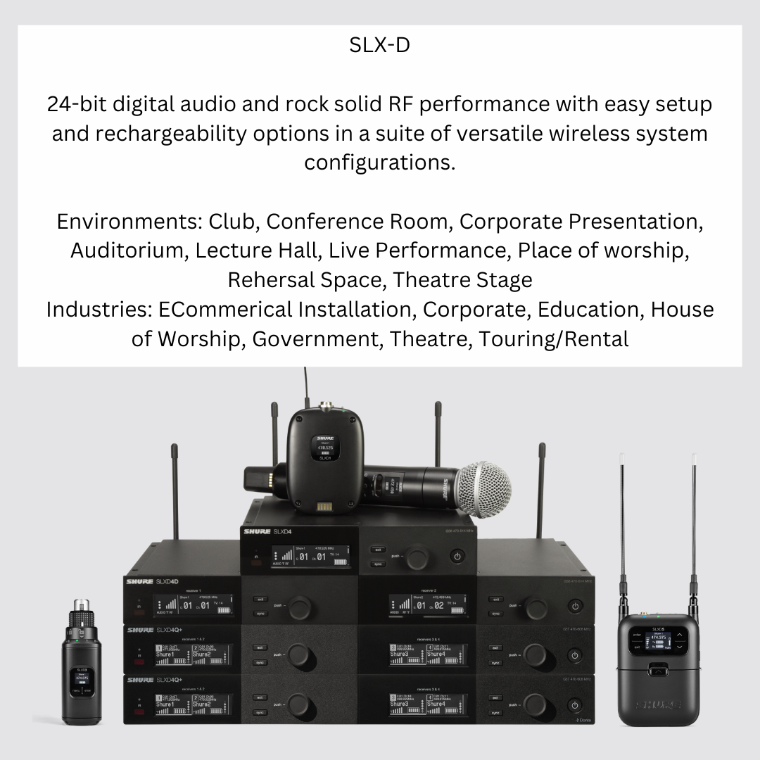 The SLXD24/B58 Wireless System delivers transparent, 24-bit digital audio and rock-solid RF performance for a wide range of applications, from day-long presentations to nighttime performances. Operate up to 32 compatible systems per 44 MHz band, with easy setup and optional rechargeability accessories for wireless excellence, wherever required. Ships with SLXD4 single-channel receiver and SLXD2/B58 handheld transmitters with antenna and rackmount accessories and 2 AA batteries.