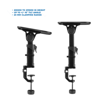 Made of steel, the SMS3 series desktop monitor stands are height-adjustable, allowing you to place your monitor speakers between 23cm and 29.5cm above the height of your desk. The stands are equipped with ergonomic rotary knobs and the clamp will work on desk surfaces up to 65mm thick. The top platform is providing sufficient surface area to support monitor speakers up to 5". For additional stability, the SMS3 series desktop monitor stands include anti slip pads and can support up to 15kg.