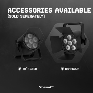 The beamZ BAC3 series is series of compact aluminium LED ProPars, developed according to the latest LED technology. The combination of high-power LEDs built into an attractive cast aluminium housing ensures highly efficient heat dissipation. This eliminates the need for an internal fan, making this Par absolutely silent in operation. The OLED display with 4 button LED menu allows for easy access to the functions including DMX, master/slave, sound activation and the stand alone function. Equipped with P-Con in/out and XLR 3-pin in/out connectors for daisy chaining multiple units together. Magnet in front for optional accessories: Filter 40° (150.812), Barndoor (150.813)