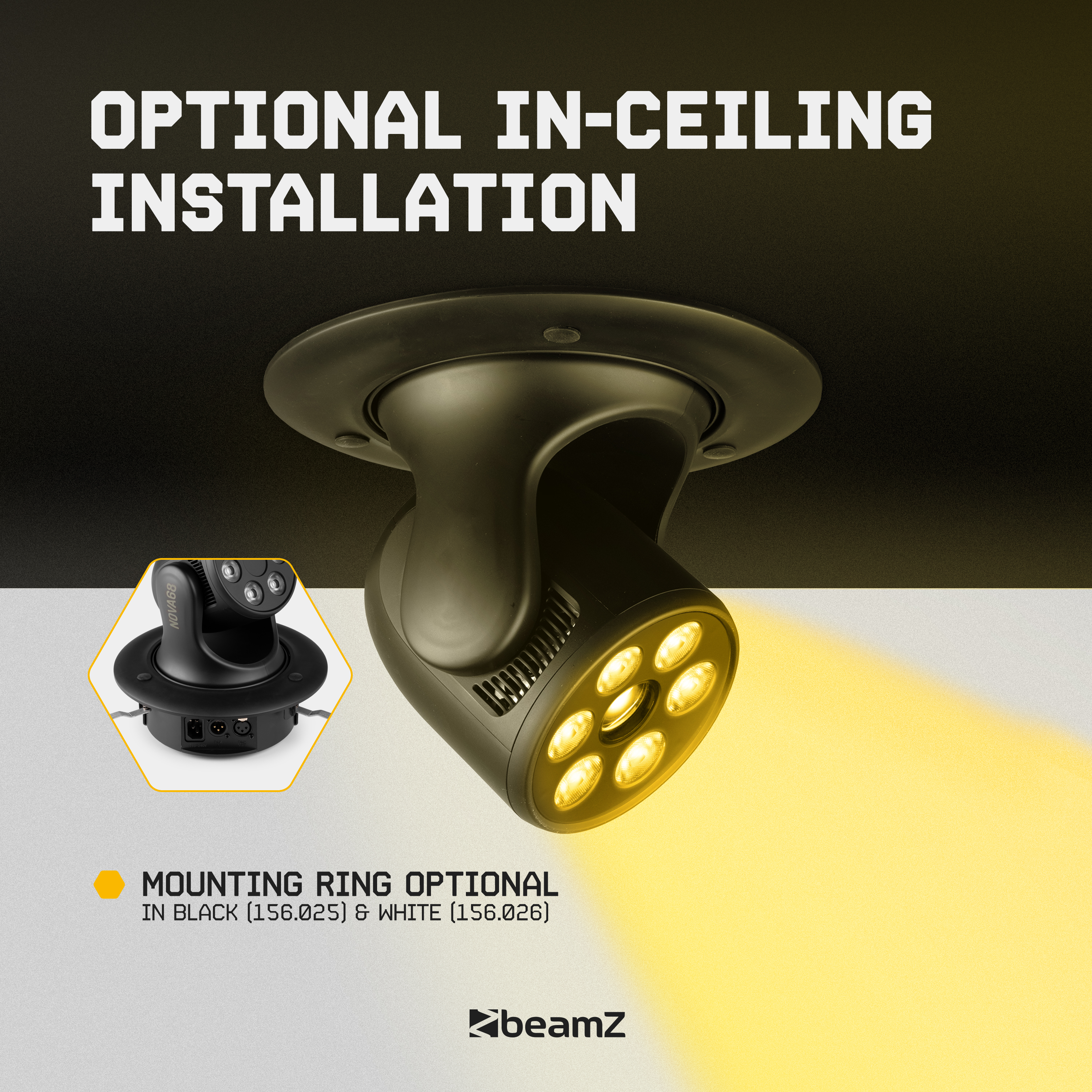 With its compact design and lightweight construction, the Nova series is perfect for installation professionals and mobile setups where space efficiency is crucial. The unique thing about this series of moving heads is that they can be used as normal moving heads, but can also be ceiling-mounted with an optional mounting ring. Whether controlled by DMX, activated by sound, or used in standalone mode with the Master/Slave function, the Nova series offers unmatched versatility and ease of use.