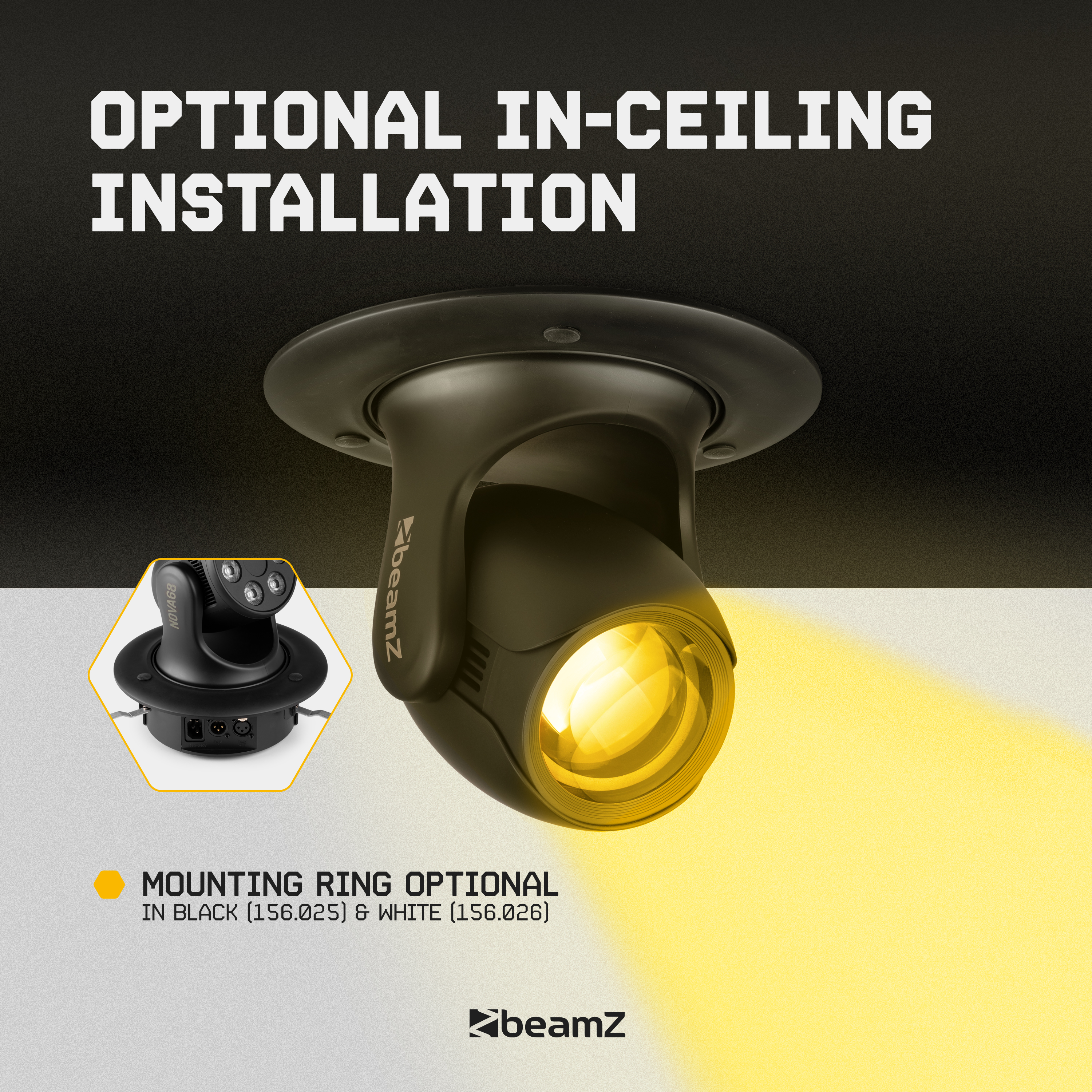 With its compact design and lightweight construction, the Nova series is perfect for installation professionals and mobile setups where space efficiency is crucial. The unique thing about this series of moving heads is that they can be used as normal moving heads, but can also be ceiling-mounted with an optional mounting ring. Whether controlled by DMX, activated by sound, or used in standalone mode with the Master/Slave function, the Nova series offers unmatched versatility and ease of use.