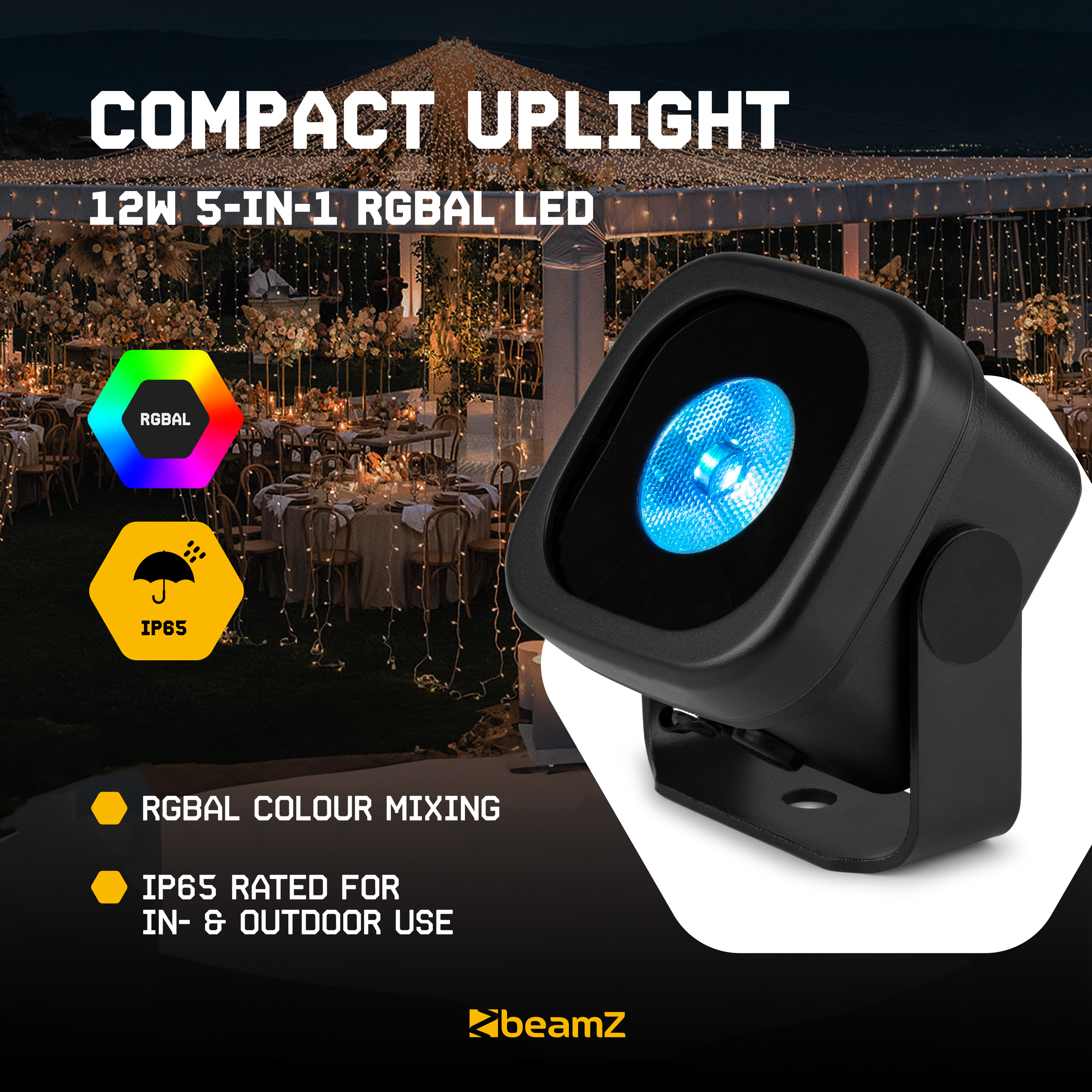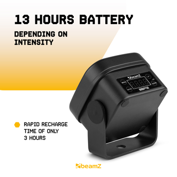 The BBP12 is a portable, lightweight uplight featuring a high-power 12W RGBAL LED, perfect for illuminating and accentuating any space. The BBP12 is designed for both indoor and outdoor use and comes with an integrated battery that lasts up to 15 hours when fully charged. (Depending on the colours and intensity) Colours can be quickly selected via the wireless DMX function, with the IR-Remote control or directly on the uplight via the menu.
