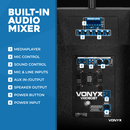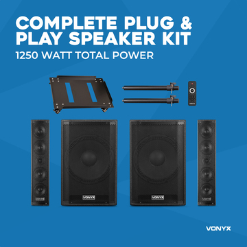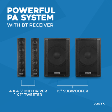 The VX1080BT is a complete plug & play speaker kit. Everything needed to get started is supplied on delivery. All the power comes from the single 15" subwoofer that houses the amplifier, both tops and the passive subwoofer are connected to the amplifier unit. The built-in BT receiver allows you to simply stream your music wirelessly from your smartphone, or you can use the built-in MP3 player with USB and SD slots.