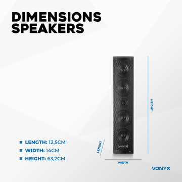 Dimensions: Per speaker | 140 x 632 x 125mm |