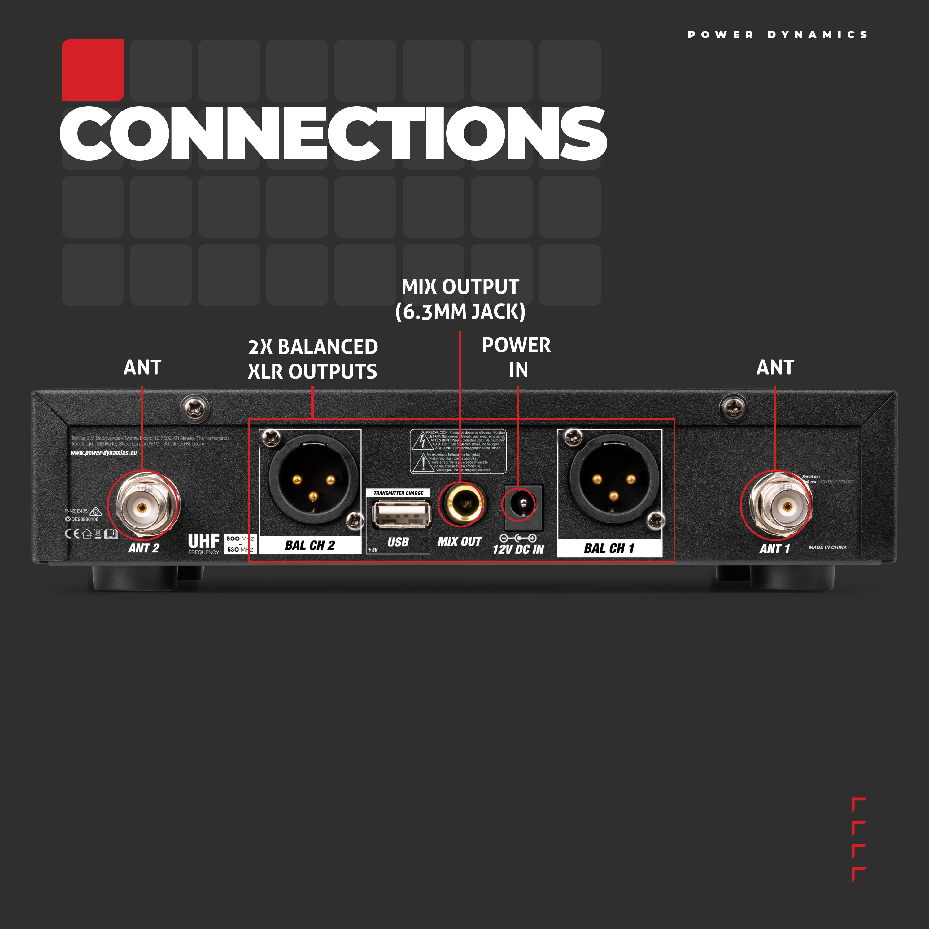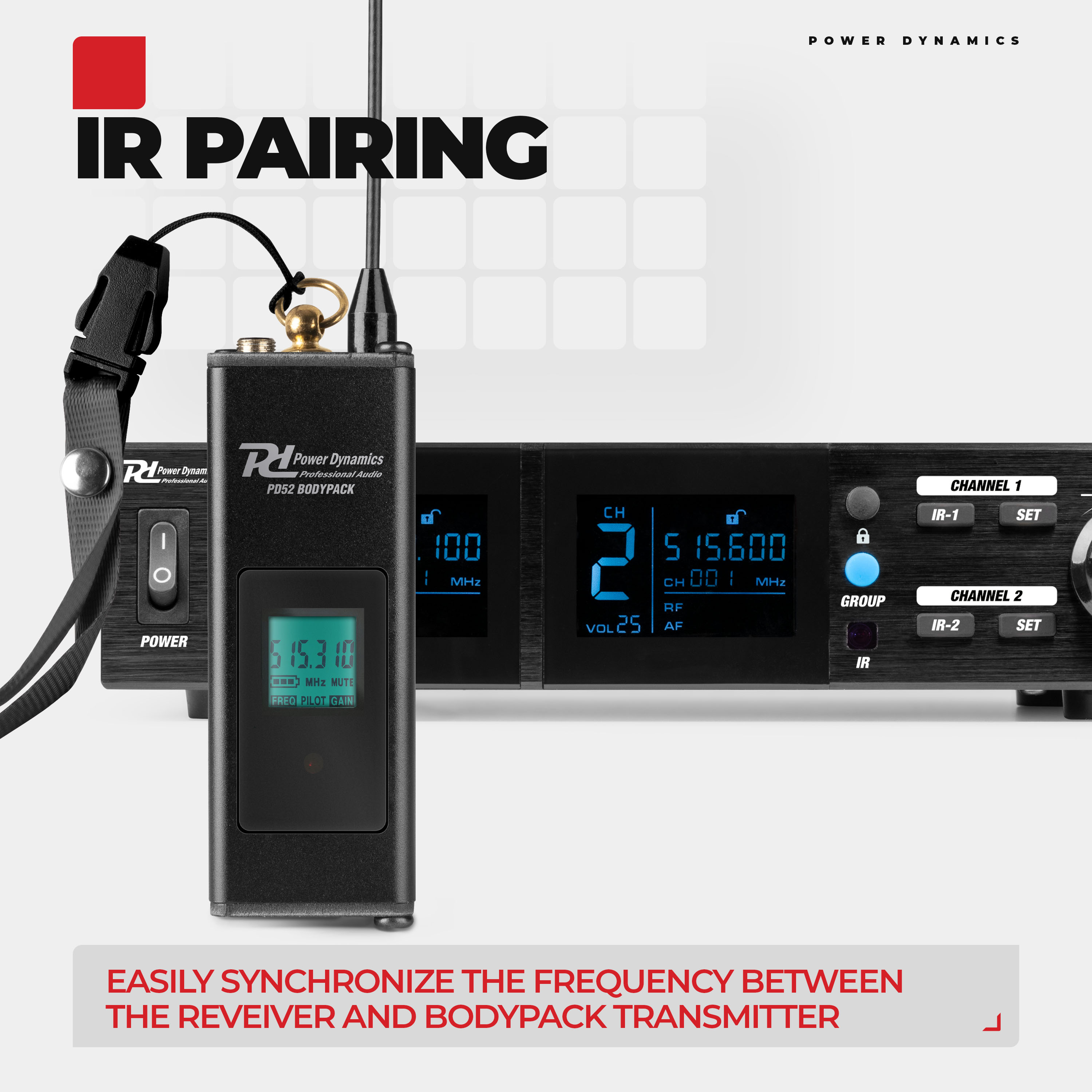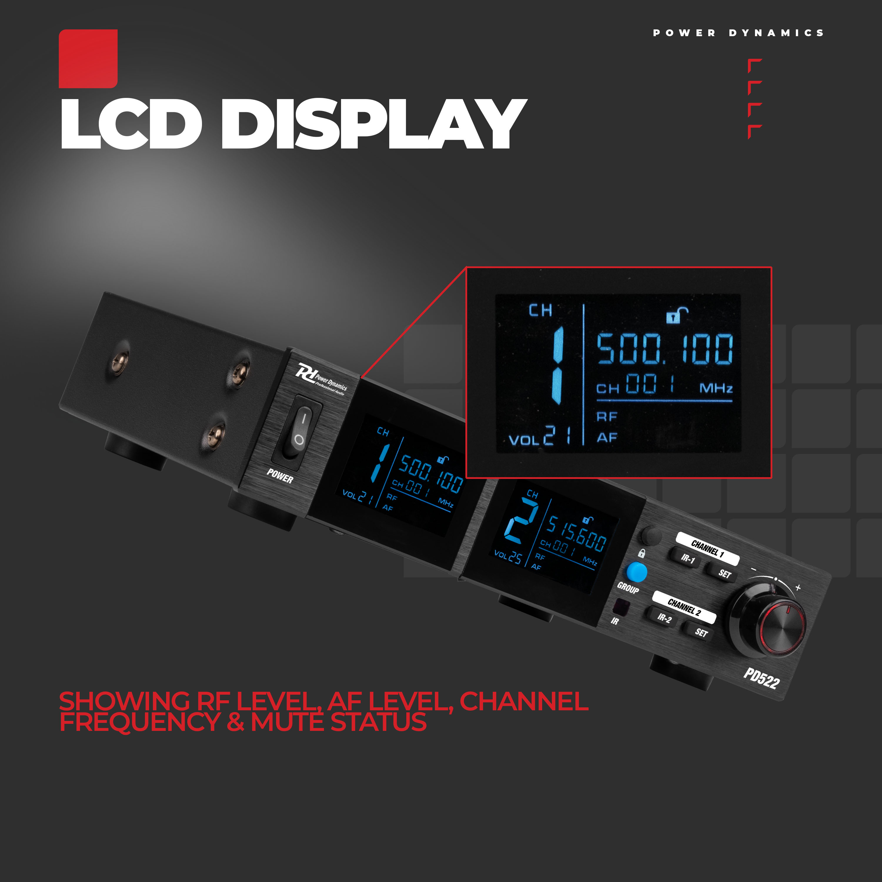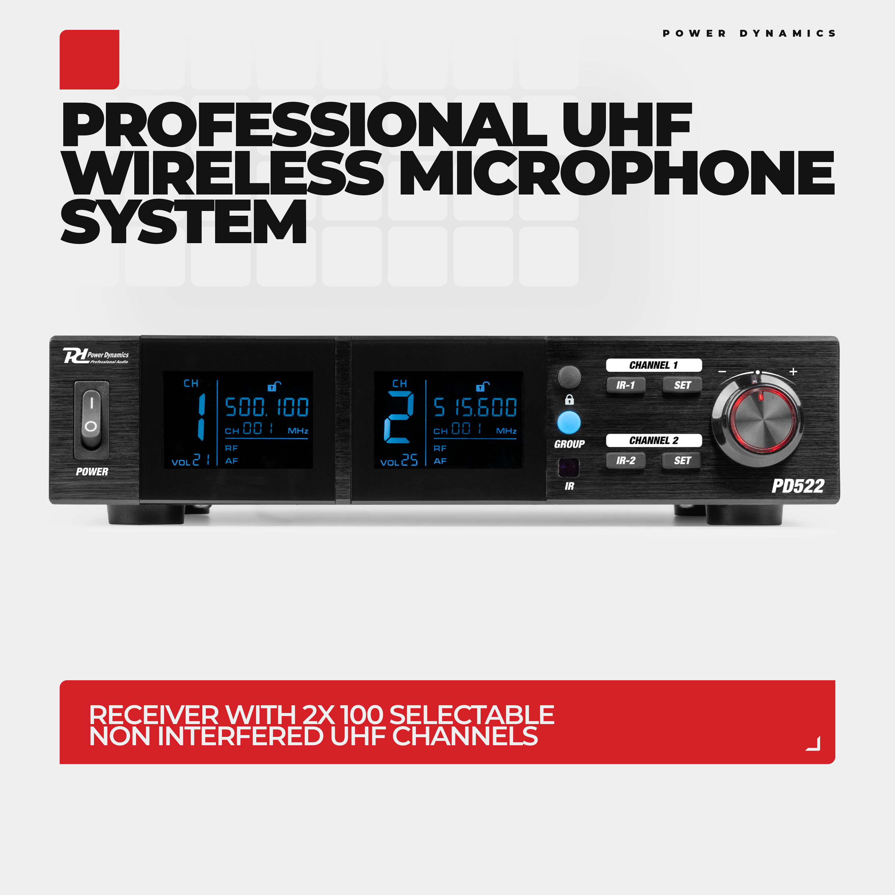 The PD522B is a professional wireless microphone system equipped with 2x 100 channels and is designed for larger performances or events. The receiver with clear dynamic LCD displays ensures interference free transmission, together with the high-quality squelch and the PLL synthesizer. The PD522B microphone system operates in the 500-530 MHz band and is suitable for vocals, presentations, training and other PA-applications.