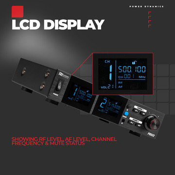 - LCD display showing RF level, AF level, Channel Frequency and mute status
