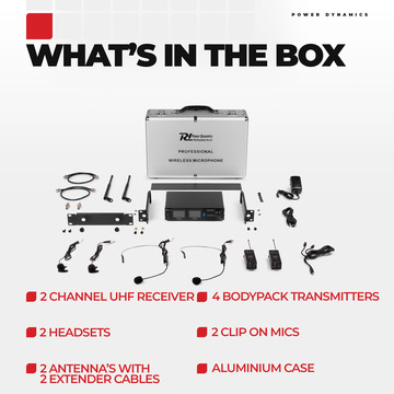 This set comes with a UHF 2 channels receiver, four bodypack transmitters with rechargeable Li-ion battery, two skin colour headsets, two tie-clip microphones, two removable BNC antennas, two extender cables for front-mounting the antennas, a power adapter and an Aluminium case. USB cables for charging the wireless microphones are also included.