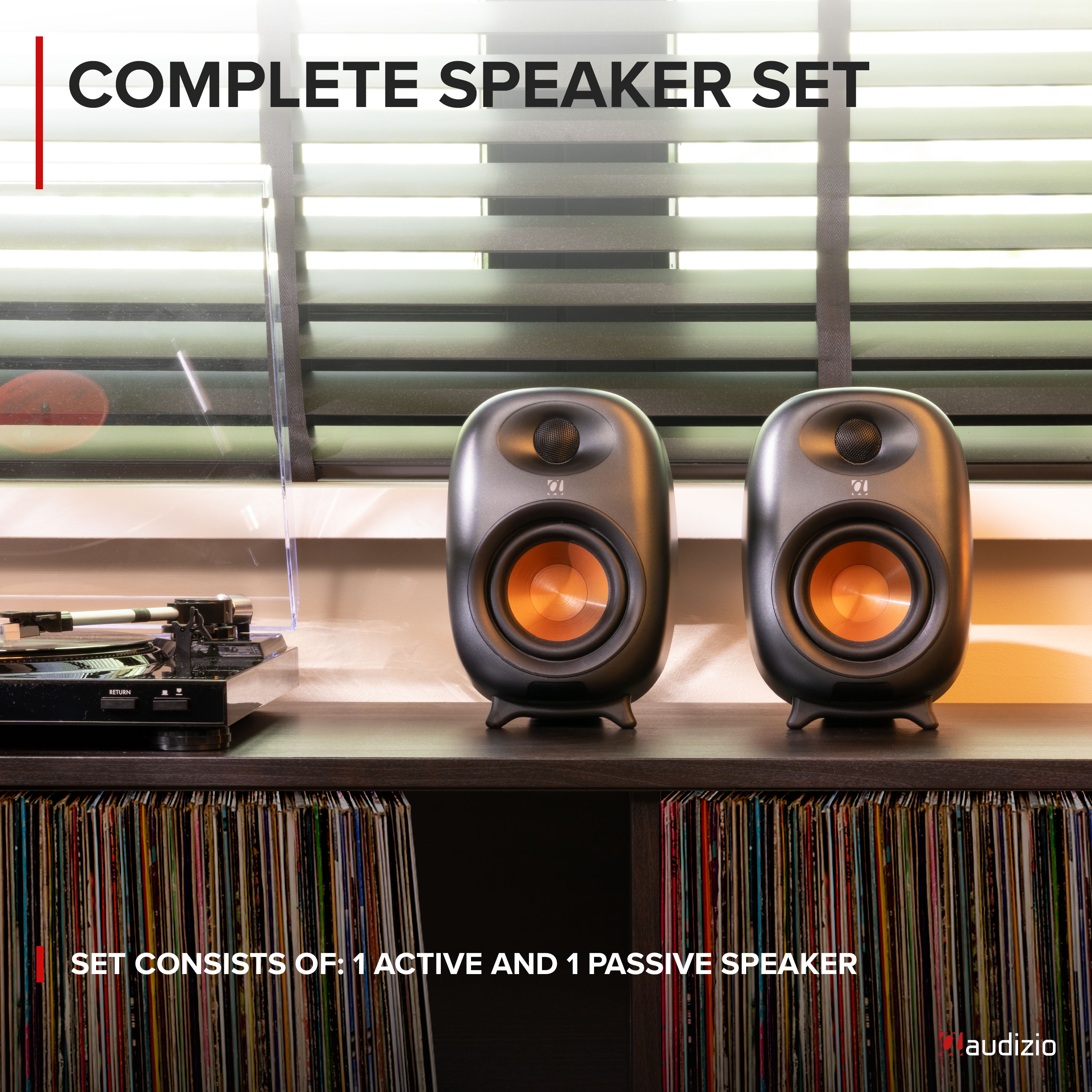 - Set consists of: 1 active and 1 passive speaker