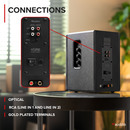 - Inputs: Optical and RCA (Line in 1 and Line in 2)