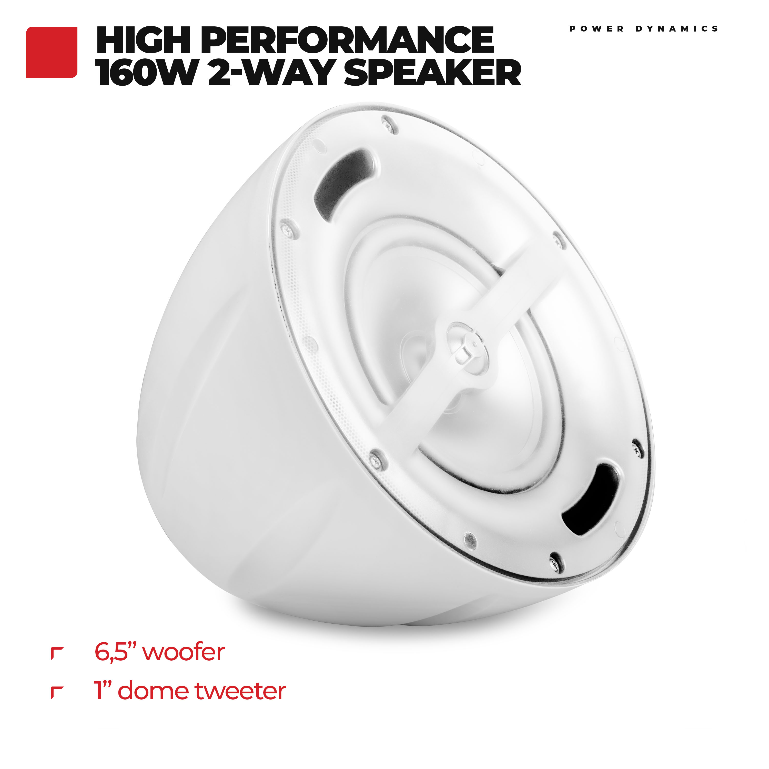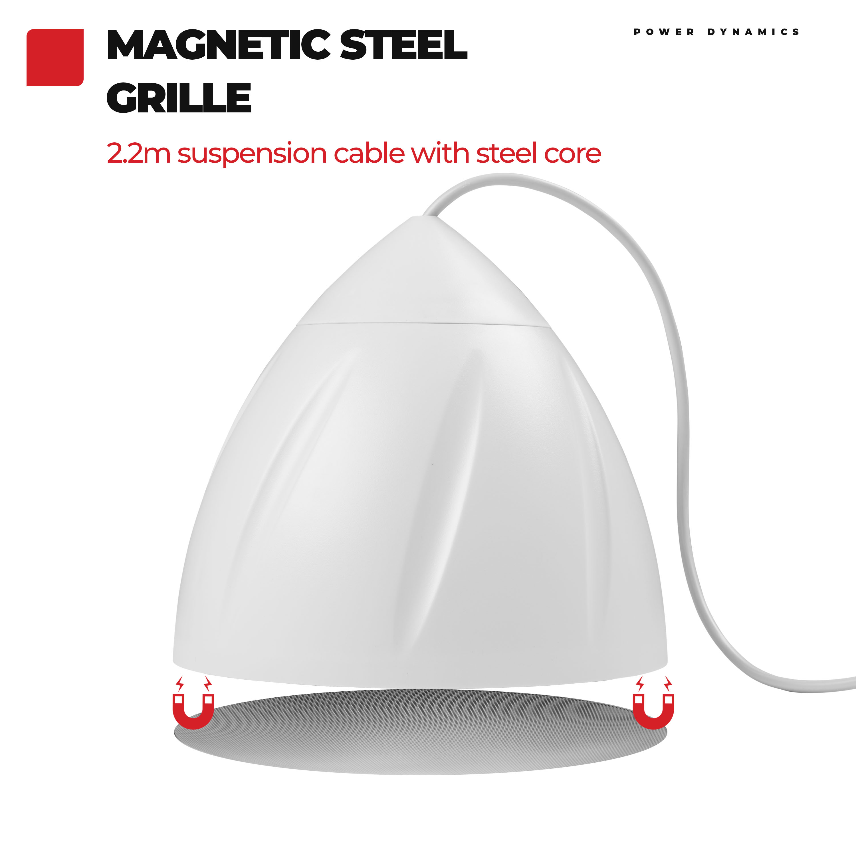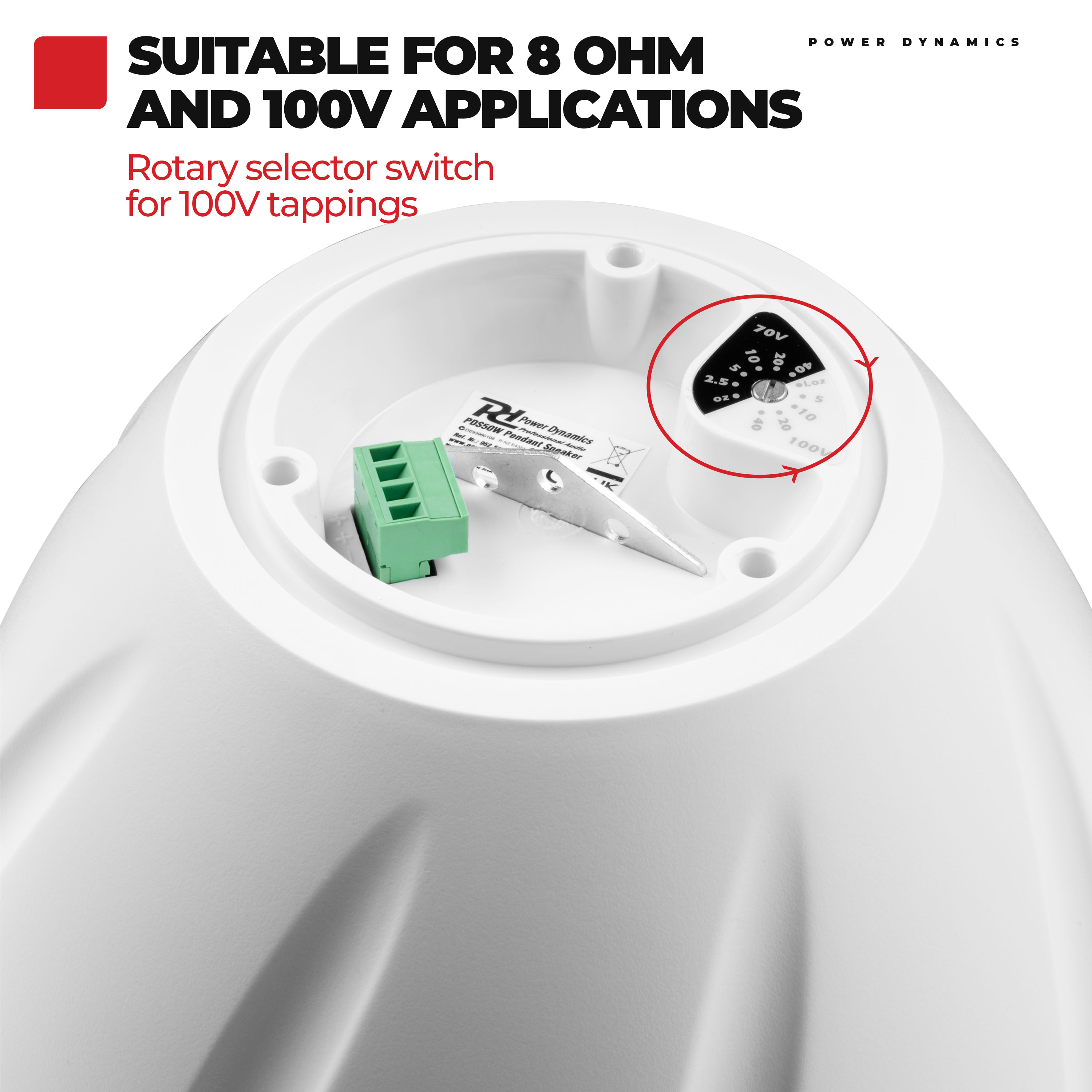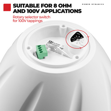 The PDS50 pendant speakers are hanging speakers ideal for use in PA background music systems. These speakers are equipped with a 6.5 inch polypropylene woofer and a 1 inch mylar dome tweeter for perfect speech reproduction and good music performance. The combination of 8Ohm and 100V makes these pendant speakers ideal for use in offices, shops, showrooms, restaurants, etc.