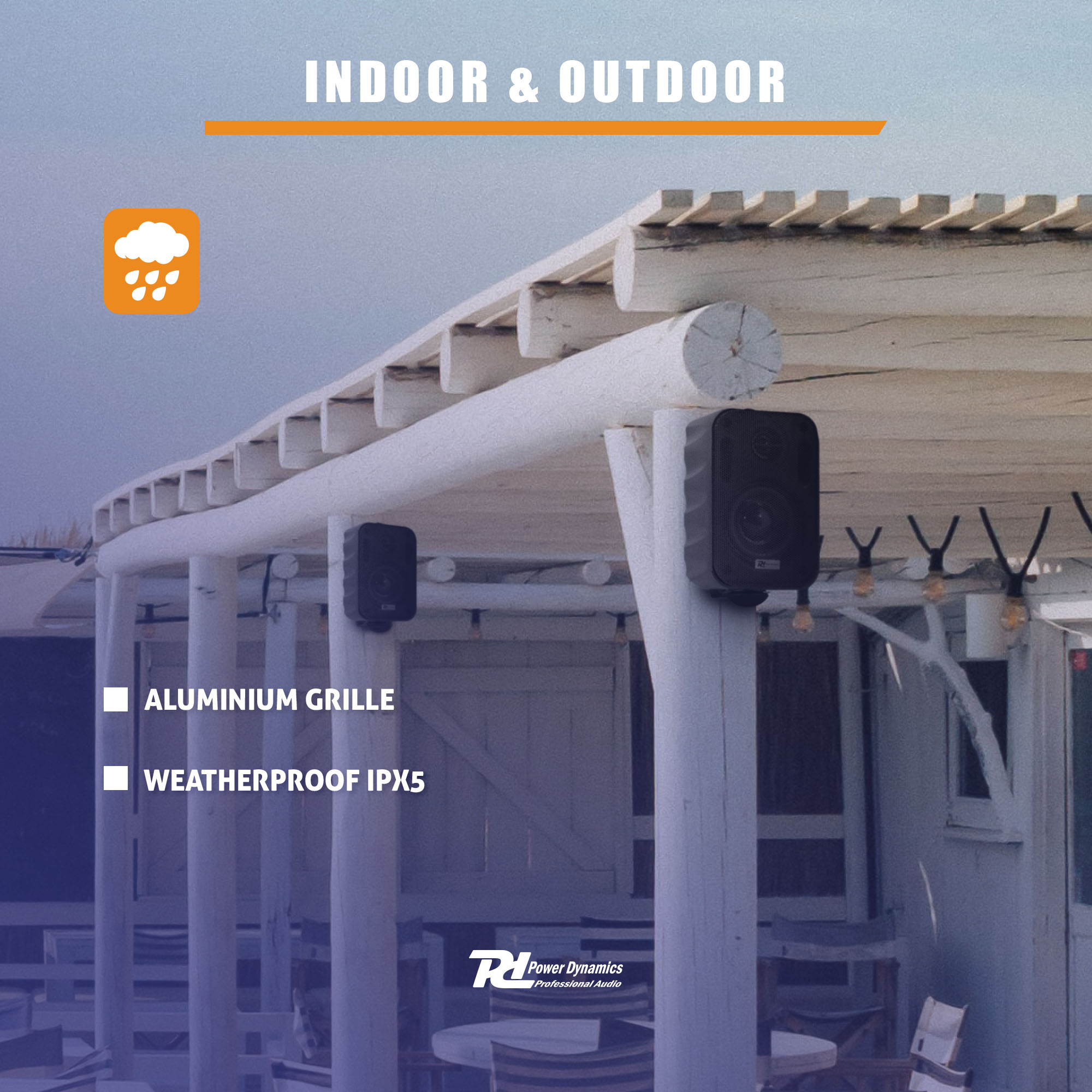 - Weatherproof (IPX5), suitable for indoor and outdoor use