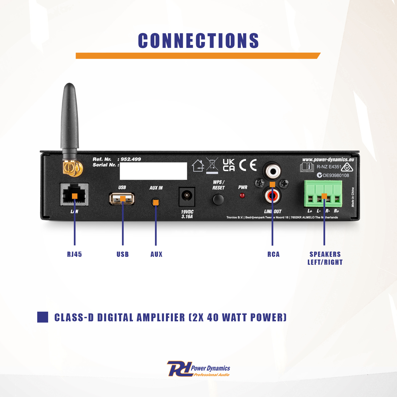 The four included WiFi amplifiers are the heart of this audio system. They can be connected to your network wirelessly via WiFi or wired with an RJ45 Ethernet cable. This way you get access to the internet radio stations or stream directly via Spotify Connect or YouTube. You can easily control the amplifiers via the free 4Stream app from your smartphone or tablet. The 3.5mm AUX input on the back of each amplifier allows you to connect devices that are not supported by Bluetooth or WiFi, such as a CD player.
