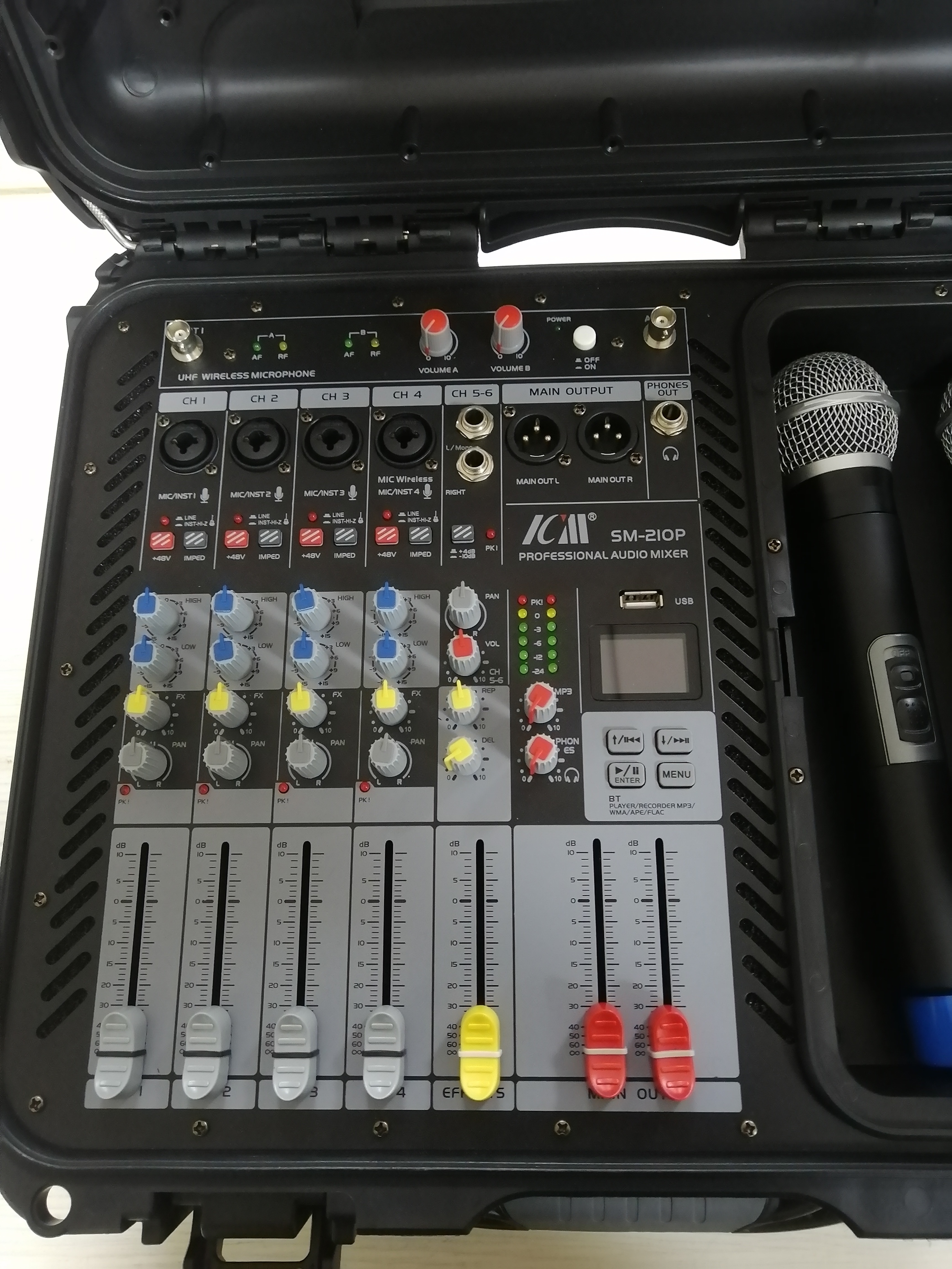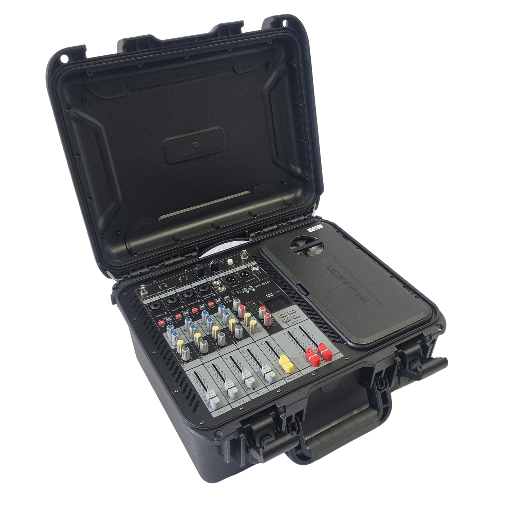 Wireless UHF Microphone CapabilityTwo reliable handheld wireless UHF microphones eliminate cable clutter, allowing performers or speakers to move freely. UHF frequencies maintain clarity and stable signal without dropout, crucial for confidence in live environments and performances. The mics are conveniently stored within the mixer's enclosure when not inuse.