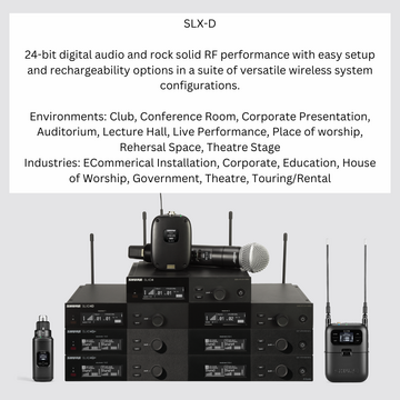 The SLXD24D/58 Wireless System delivers transparent, 24-bit digital audio and rock-solid RF performance for a wide range of applications, from day-long presentations to nighttime performances. Operate up to 32 compatible systems per 44 MHz band, with easy setup and optional rechargeability accessories for wireless excellence, wherever required. Ships with SLXD4D dual-channel receiver and two SLXD2/B58 handheld transmitters with antenna and rackmount accessories and 4 AA batteries.