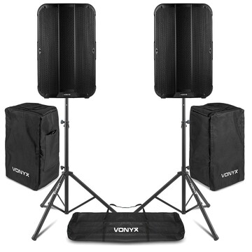 This all-in-one audio package is an ideal solution for anyone needing a reliable DJ setup or professional band system. It includes a pair of Vonyx VD715A 15-inch active speakers, each matched with a fitted PA speaker cover, plus sturdy speaker stands, making the system ready for live sound in any environment. With DSP settings and Bluetooth technology, the system is adaptable to suit a variety of PA applications from mobile gigs to fixed venues.