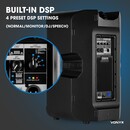 Key Features and Benefits Bi-amped Power and DSP TuningEach speaker utilises a bi-amp Class D amplifier, providing a combined 1800W max output and 450W RMS per cabinet. Four selectable DSP modes (Normal, Monitor, DJ, Speech) ensure your sound is tailored, whether it's punchy dance music or vocal clarity for speeches.