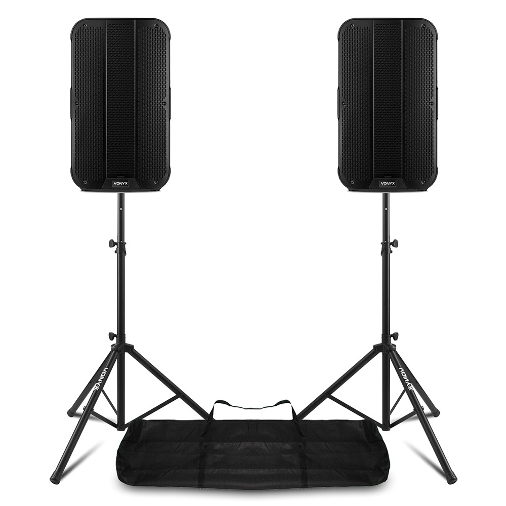 This comprehensive powered PA speaker package combines twin Vonyx VD712A units with robust adjustable tripods, forming an integrated 1600W audio solution ready forprofessional live events. Offering powerful class D amplification, versatile DSP audio presets, comprehensive mixing and connectivity options, the compact and portable configuration suits diverse indoor and outdoor audio reinforcement demands.