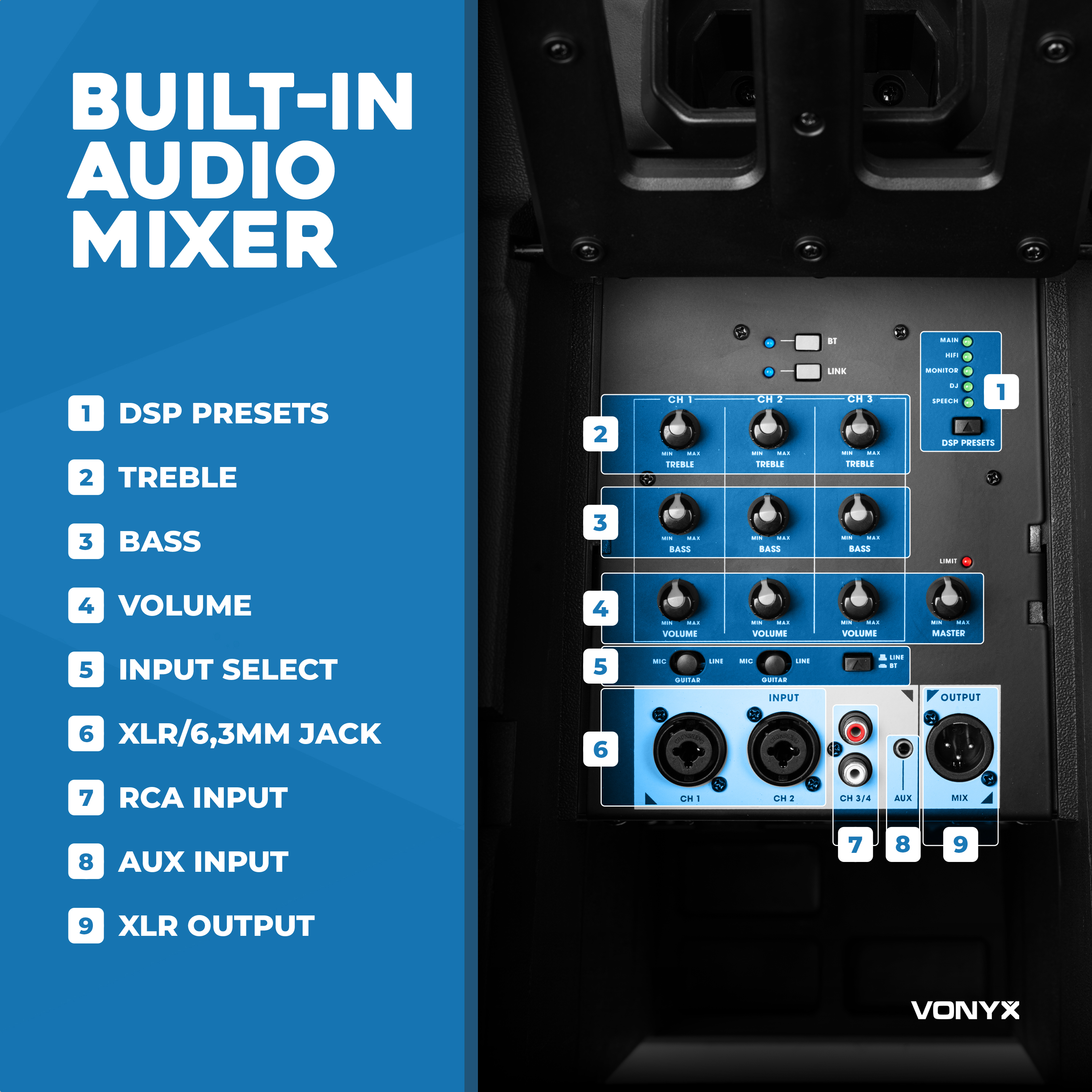 The 4-channel mixer in each unit features Bluetooth 5.0, and offers versatile input options for modern devices. Its main two channels have balanced and unbalanced inputs with switchable preamps to suit microphones, musical instruments, or a line level source. Each channel includes bass and treble adjustment, and the mixer also features RCA and 3.5mm Aux inputs. The selectable TWS function allows for convenient wireless stereo pairing of the two columns when playing audio from a Bluetooth source