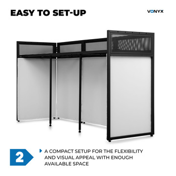 The Vonyx range of DJ booths offers a perfect blend of professional design, durable construction, and practical features, ideal for mobile DJs, rental companies, and event venues. Whether you need a compact setup for smaller gigs or a wide booth for a full DJ rig, Vonyx DJ booths provide the flexibility and visual appeal to match any performance. Featuring two interchangeable coloured lycra covers (in black and white), you can customise the look of your booth and integrate lighting effects or uplighting.
