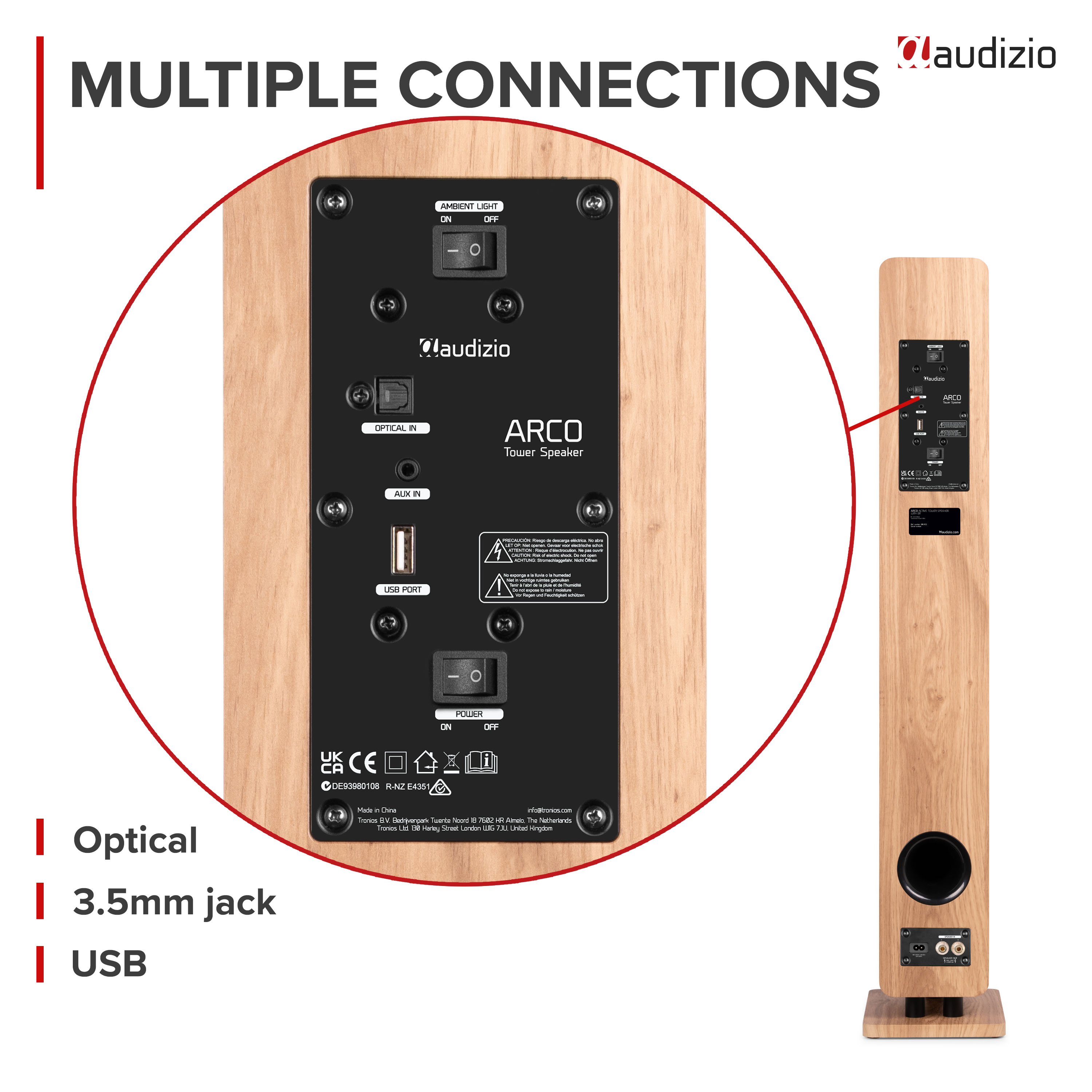 The ARCO Active Tower Speaker comes fully equipped with BT connectivity, USB input, and an Optical input, ensuring seamless playback from various sources. With its pairing function, you can connect it to another active or passive ARCO Tower Speaker for an enhanced stereo experience. Adding to its ambiance, the built-in atmospheric downlight at the base of the speaker creates a visually stunning effect, making your music experience not only sound incredible but look great too. Whether you're streaming your favourite playlist or watching a movie, the Audizio ARCO series provides premium sound with modern convenience.