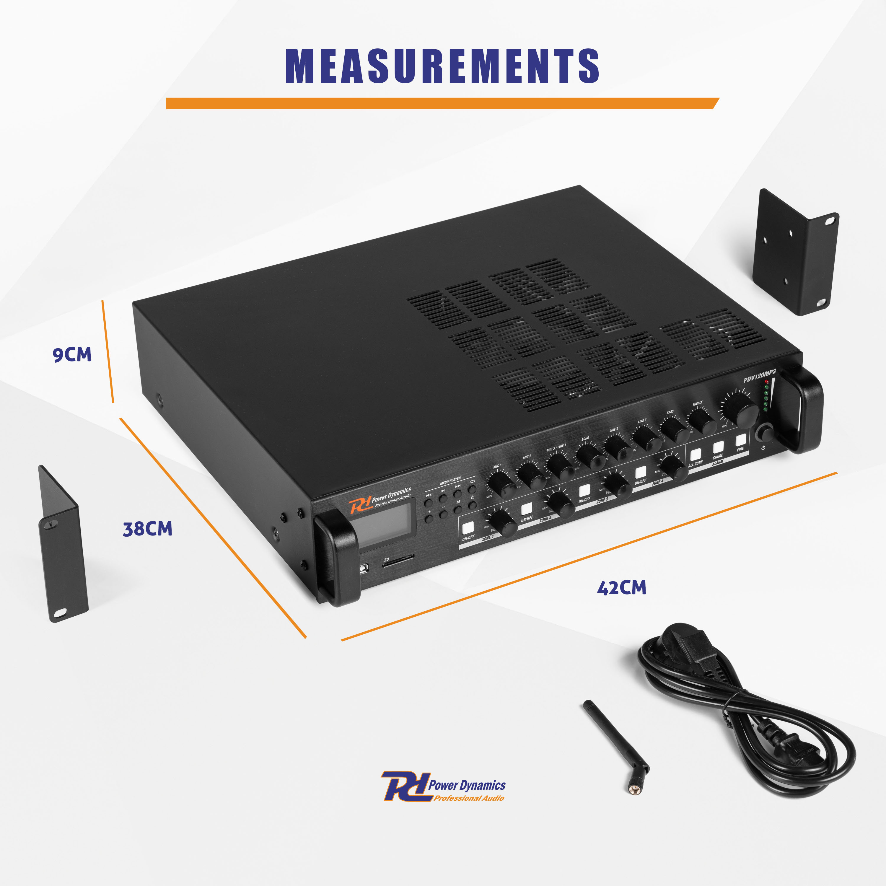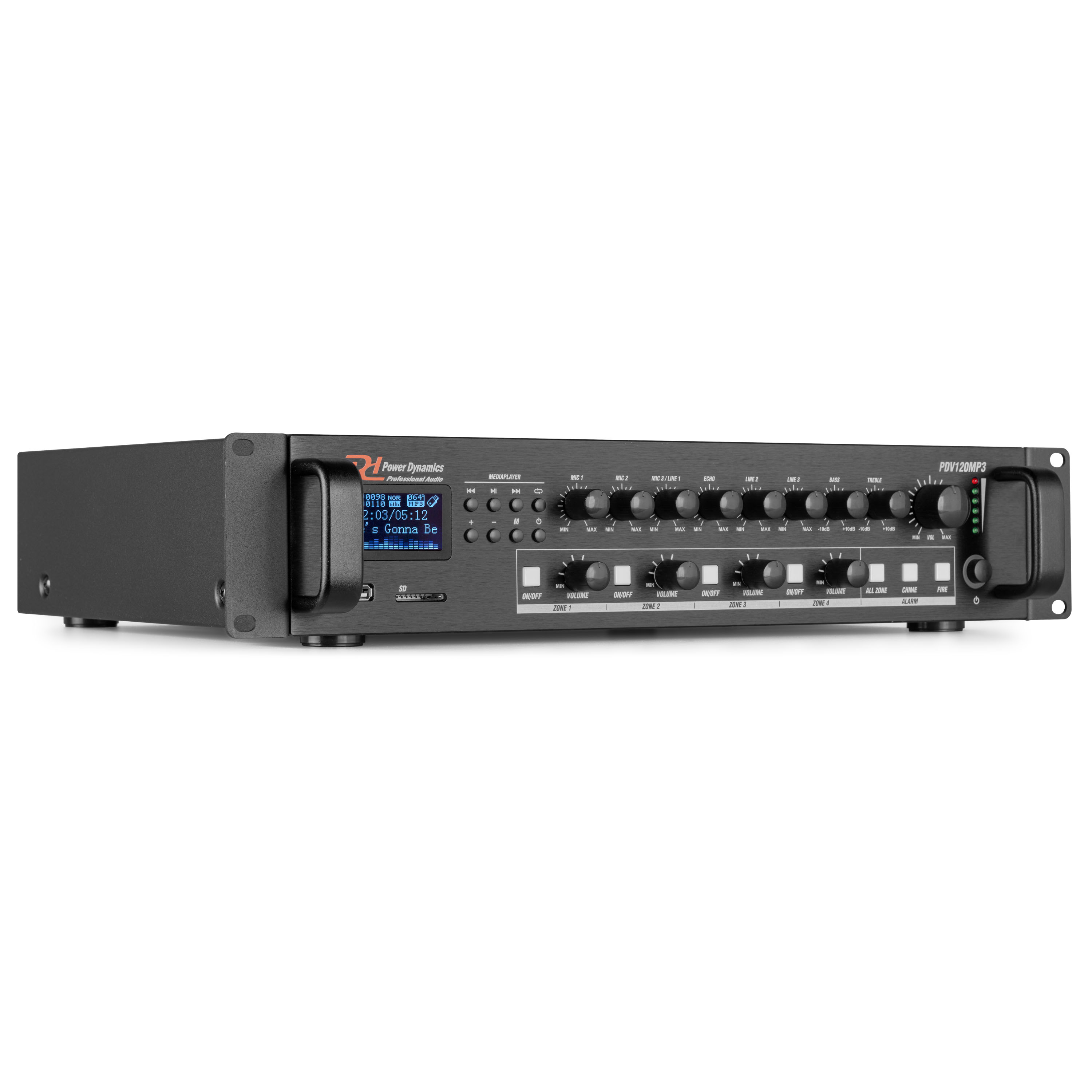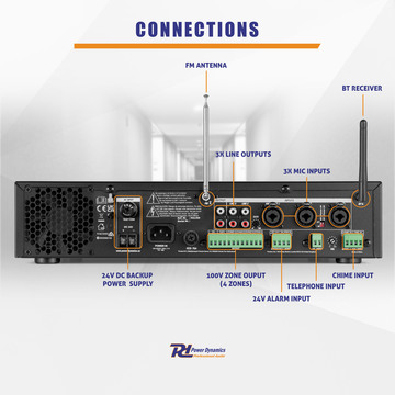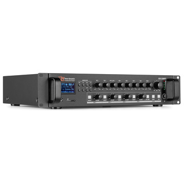 The PDV series is a range of fully featured, high power mixer amplifiers with 4 zone outputs, each with separate 6-step volume controls. This series amplifiers features an integral MP3 module with USB and SD Card slot, a FM tuner and internal Bluetooth receiver. Mic 1 channel has an override over all inputs and MP3 player. 24V contacts can be connected to a fire alarm panel for emergency evacuation if required. All models are designed with complete protection from overload to avoid any damage. This series of amplifiers is suitable for applications in a bank, town hall, supermarket, school, hotel, restaurant, shopping centre or any other public space.