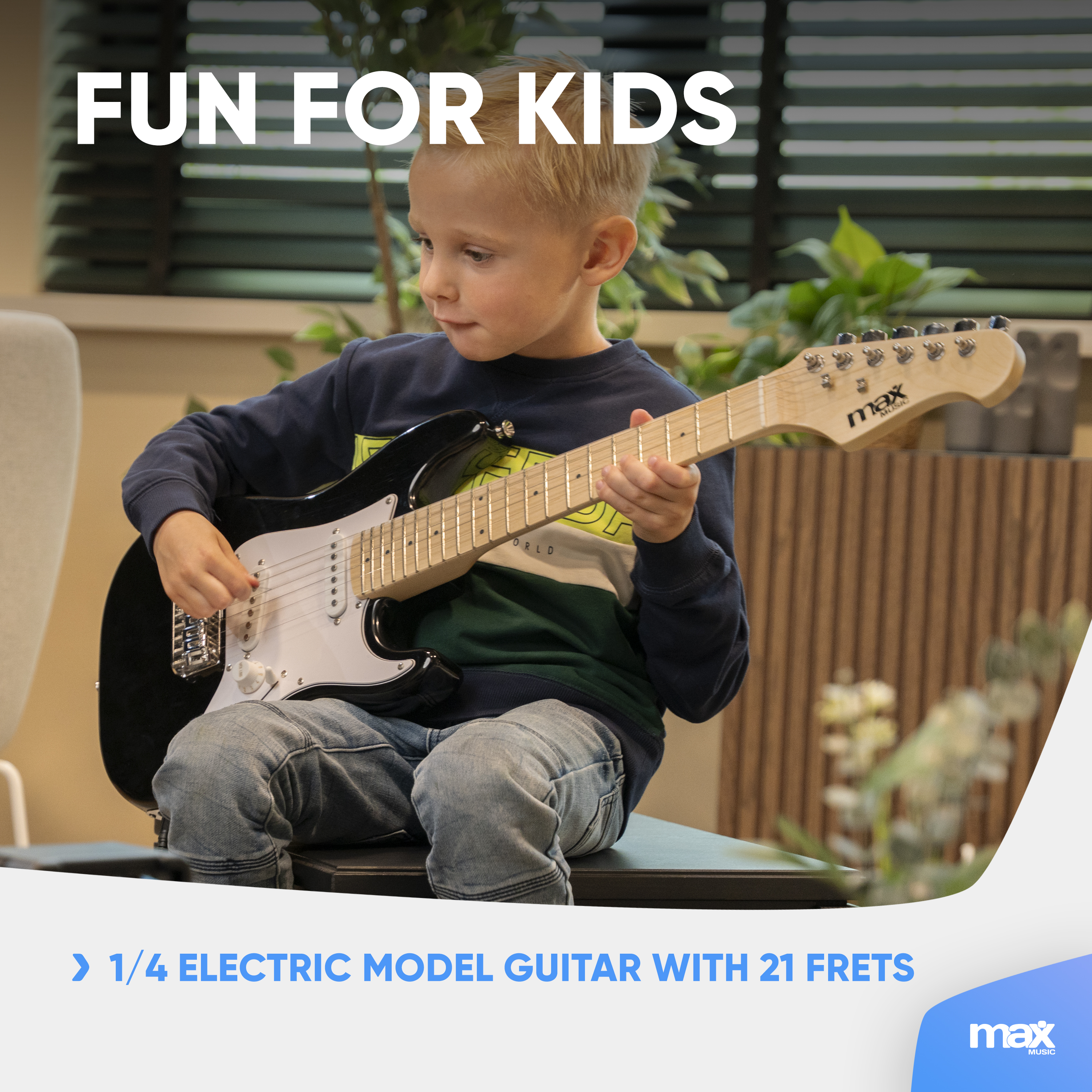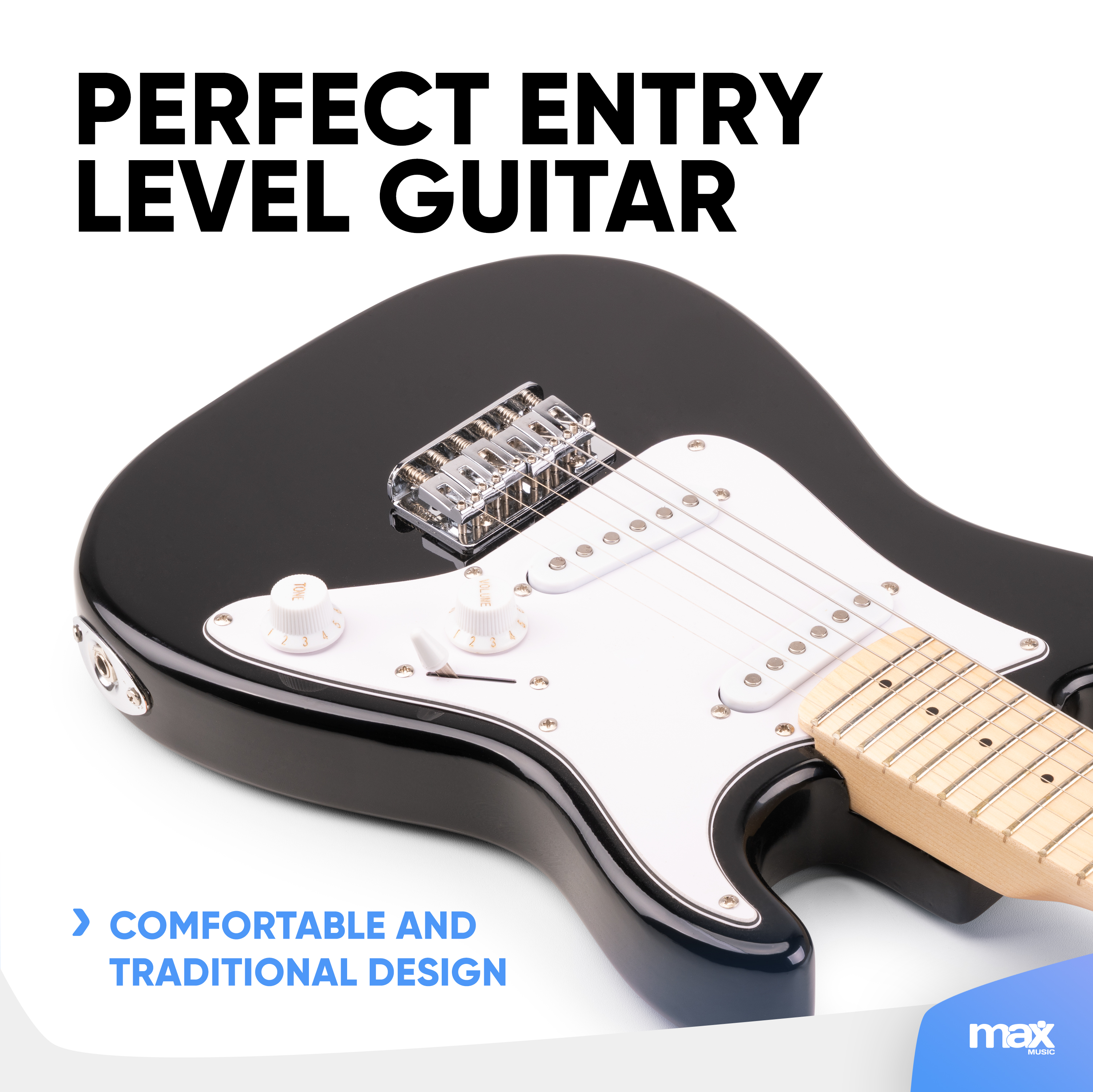 The Gigkit Junior Electric Guitar Pack is ideal for beginning players and provides a comfortable playing feel. This beginners pack offers a time tested traditional electric guitar design. Coupled with a classic Max amplifier, this set-up is designed for lovely clean guitar tones and even some crunchy classic rock material. This is great value for money entry level guitar package for young starters.