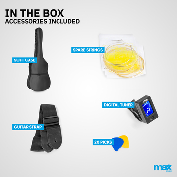 All necessities are included in this package. Besides the guitar, you'll get a digital tuner, spare strings, a guitar bag, shoulder strap and picks.