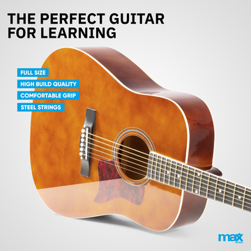 This acoustic steel-string guitar is ideal for anyone that wants to start playing the guitar, or wants to get back into it. It is a full size guitar with steel strings. The body is designed in a classic dreadnought style, which ensures a tremendous sound combined with a western look. This model is suitable for all ages from age 10 onwards. With all accessories included, you're ready to start playing instantly.