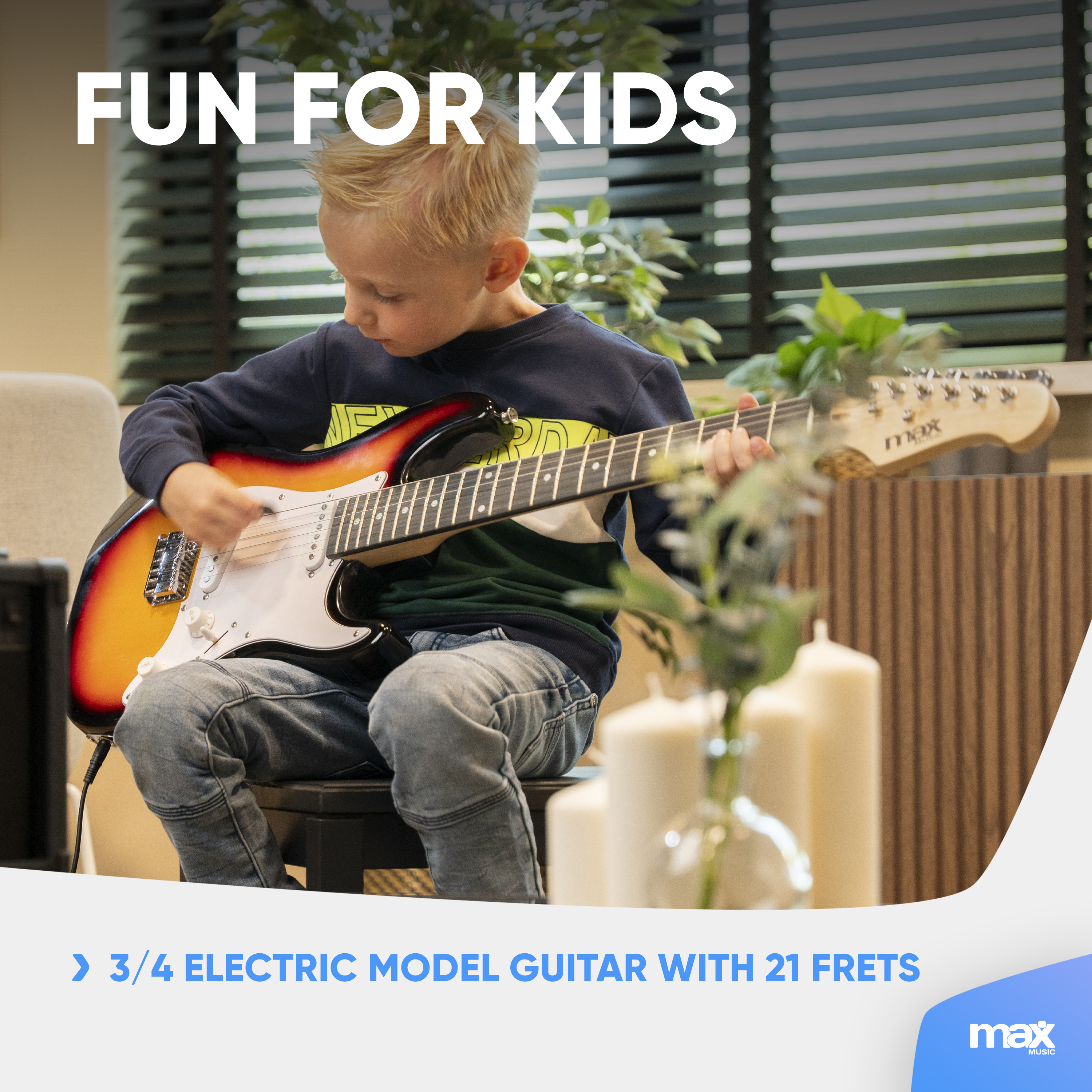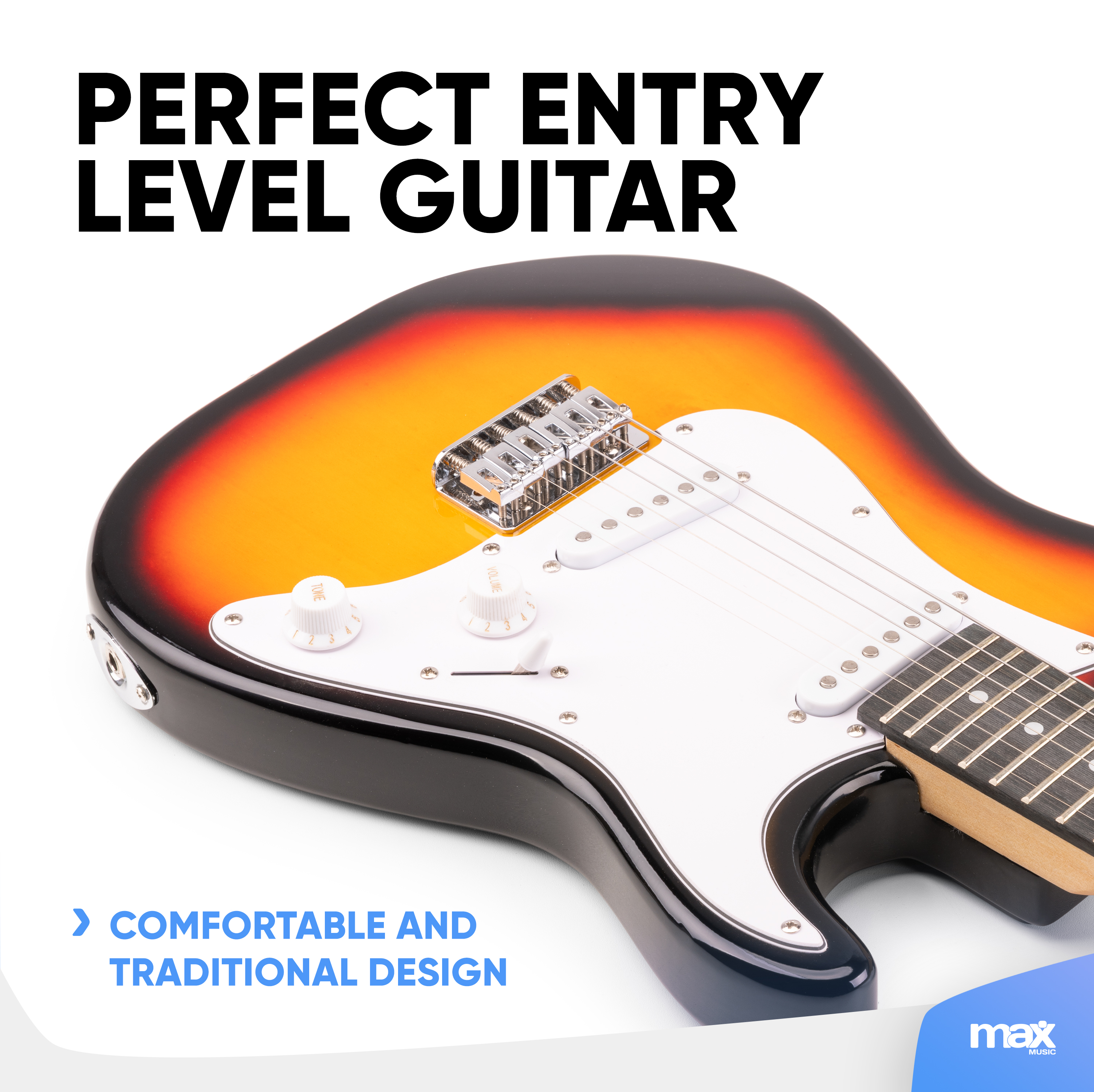 The Gigkit Junior Electric Guitar Pack is ideal for beginning players and provides a comfortable playing feel. This beginners pack offers a time tested traditional electric guitar design. Coupled with a classic Max amplifier, this set-up is designed for lovely clean guitar tones and even some crunchy classic rock material. This is great value for money entry level guitar package for young starters.