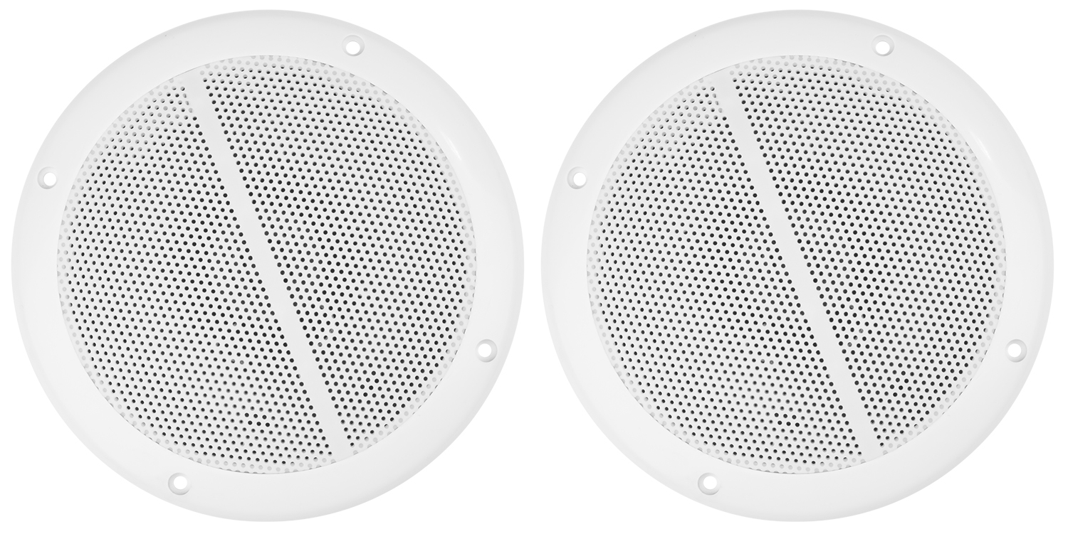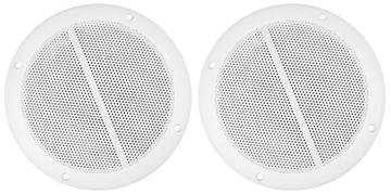 Set of 2 water resistant speakers for panel or ceiling mounting. This waterproof design can withstand rain, splashing and hosing down (but not submersion). They are also UV resistant so they will not break down under long exposure to the sun. Ideal for boat use or for use in PA installations such as swimming pool areas, bathrooms etc.