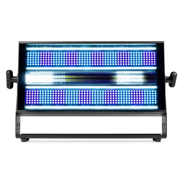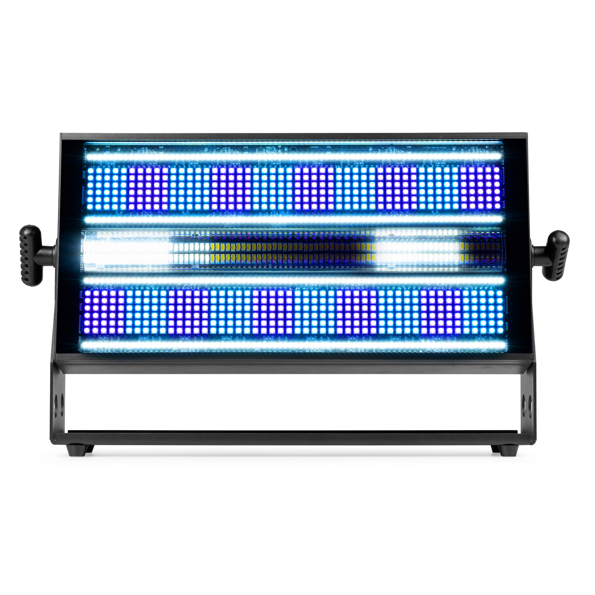 The BS1200 is a powerful, multifunctional fixture designed to function as a strobe, blinder, and wash light, thanks to its 1,160 SMD LEDs. The LED panel is divided into multiple sections and, with its RGB mixing system, can flash in any desired colour. Additionally, the fixture features a central strip with 240 cool white SMD LEDs and four rows containing a total of 320 cool white and warm white SMD LEDs. These sections can be controlled independently, allowing you to recreate the classic look of a traditional strobe. The BS1200 enables the creation of unique, colourful lighting effects and is easy to operate via DMX or in stand-alone mode with automatic functions. Perfect for shows and events of any scale.