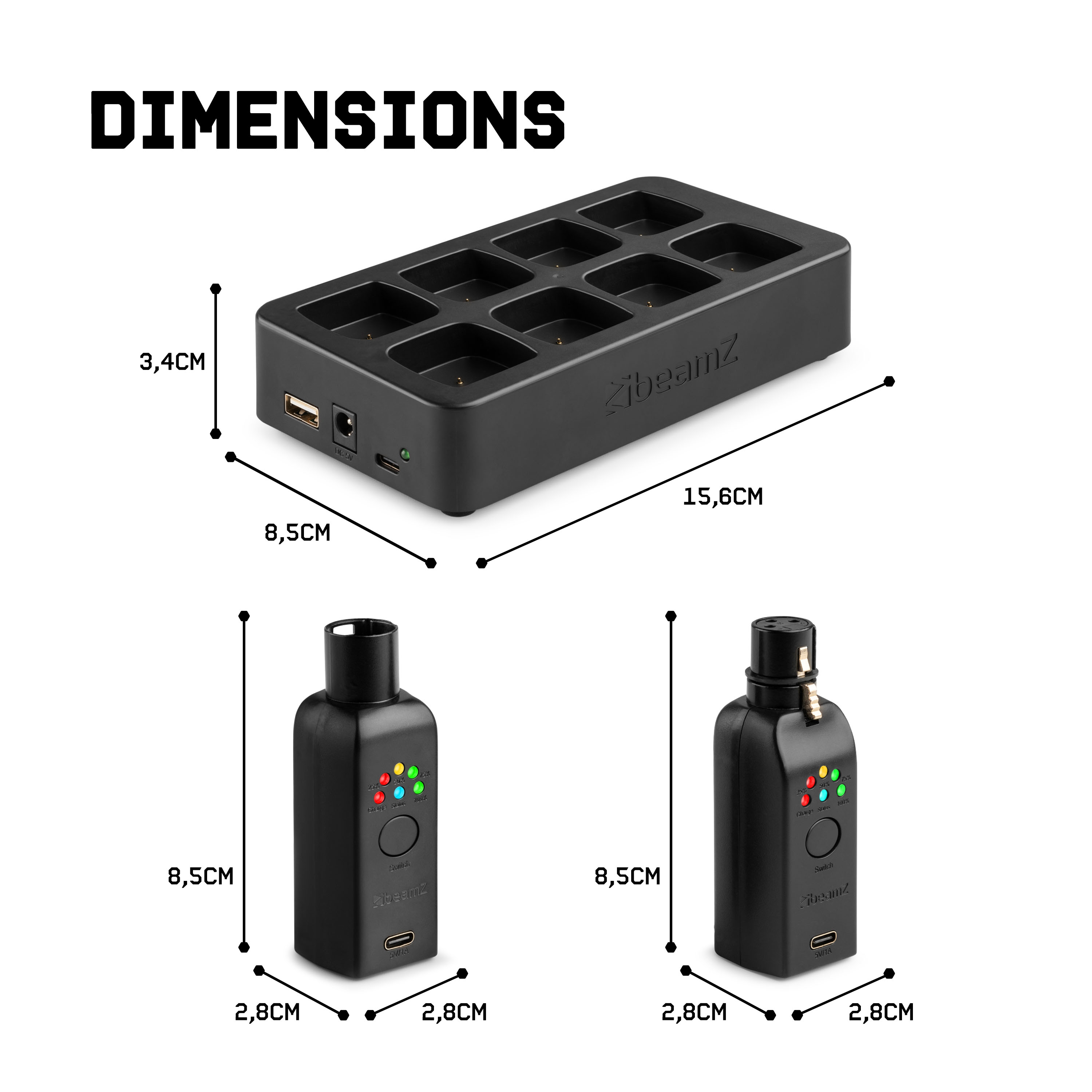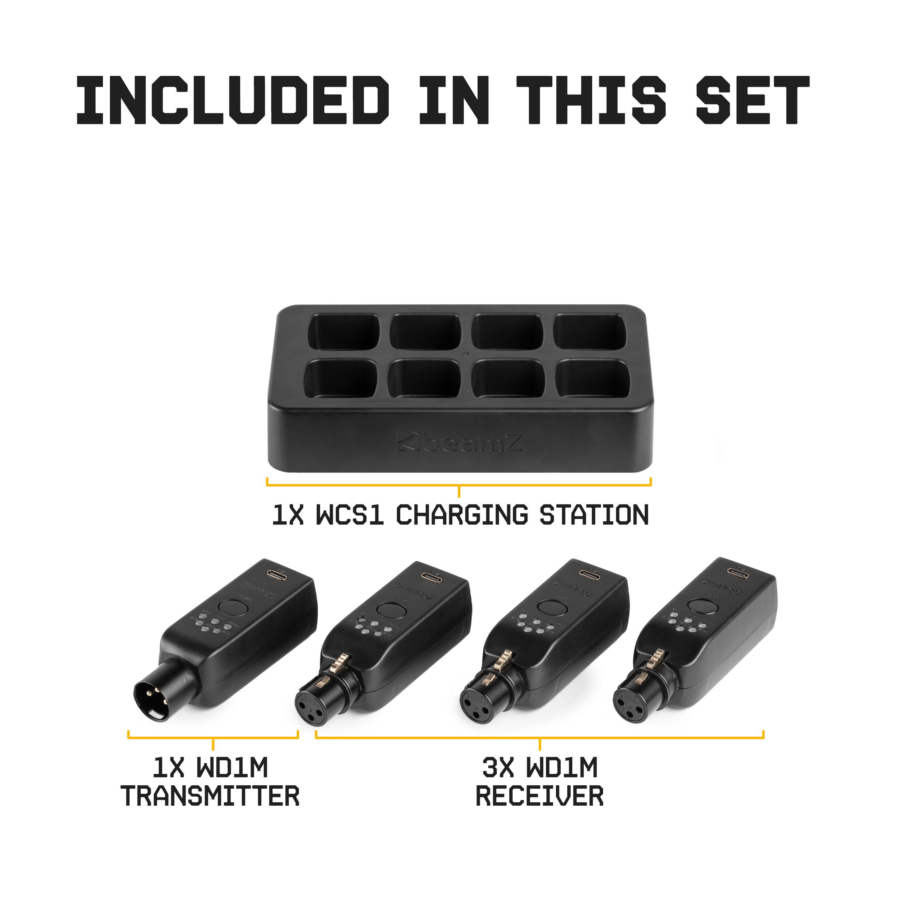 With this complete EazyLink DMX system, you say goodbye to long DMX cables. The DMX set consists of 3 WD1F DMX receivers, one WD1M DMX transmitter, and the WCS1 charging station. The set is suitable for a wide range of applications, from clubs and indoor events to mobile DJs and live bands. In fact, anyone who wants to avoid cable clutter will benefit from this DMX system from BeamZ. It works very simply: connect the transmitter to your light controller, place the receivers on your DMX fixtures, and within seconds everything works without a single cable in sight. This way, you create an organized and wireless light show in no time.
