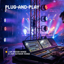 Connecting this wireless DMX system is very simple. You connect the transmitter via the 3-pin XLR connector on your controller or DMX fixture. You plug the seven receivers directly into the DMX input of your fixtures. The signal is paired within seconds, and you can control every fixture wirelessly. No more hassle with dragging long cables, tripping hazards on stage, or tidying up cables after a show.