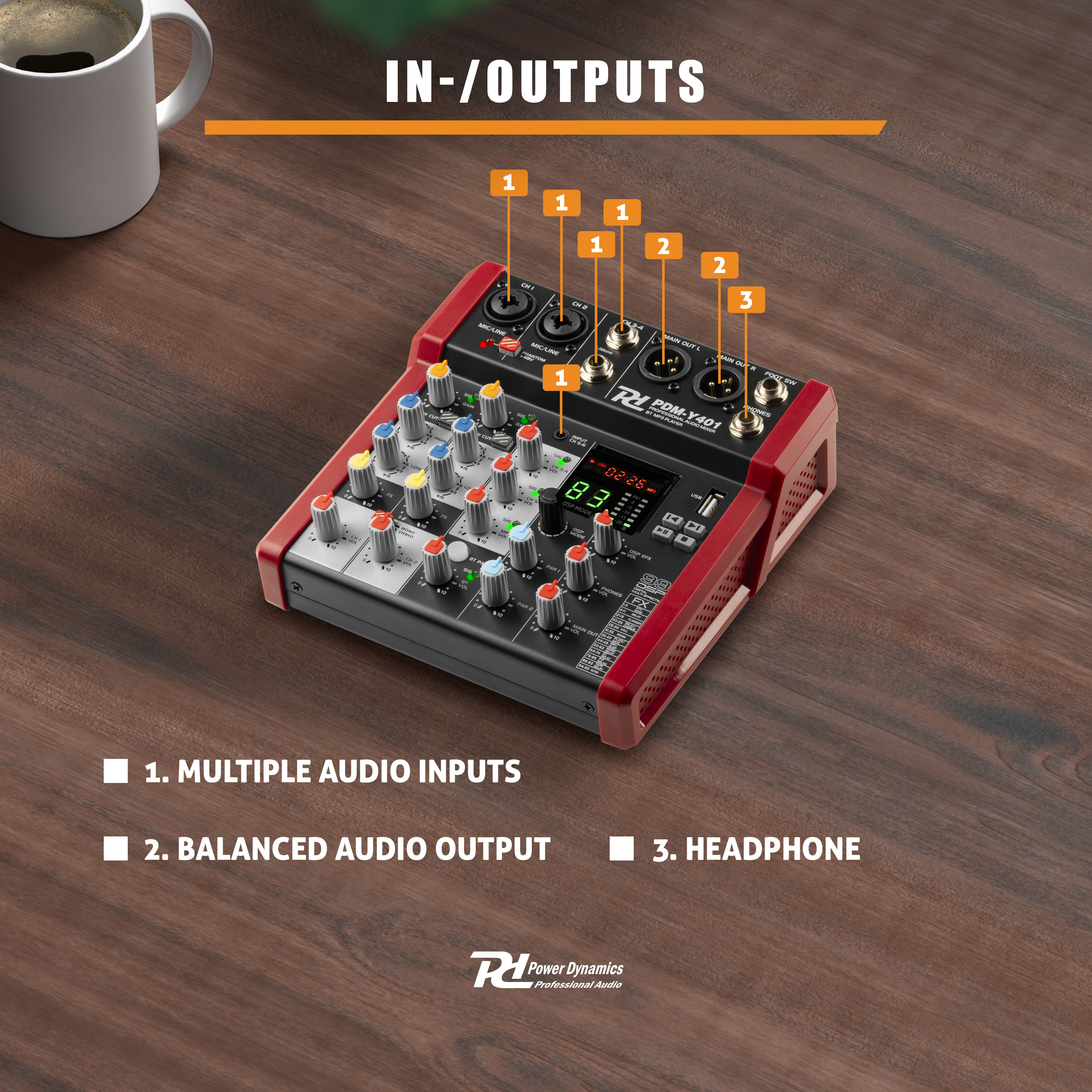 This mixer series is equipped with a 24-bit, 48KHz sampling Digital Signal Processor (DSP), boasting an impressive selection of 99 adjustable effects. To ensure a stable power supply, the PDM-Y mixers are equipped with +48V phantom power functionality and are accompanied by a external power adapter. The inclusion of an echo effect and a built-in USB player with an MP3 playback display adds further versatility to these mixers, enhancing their capabilities.