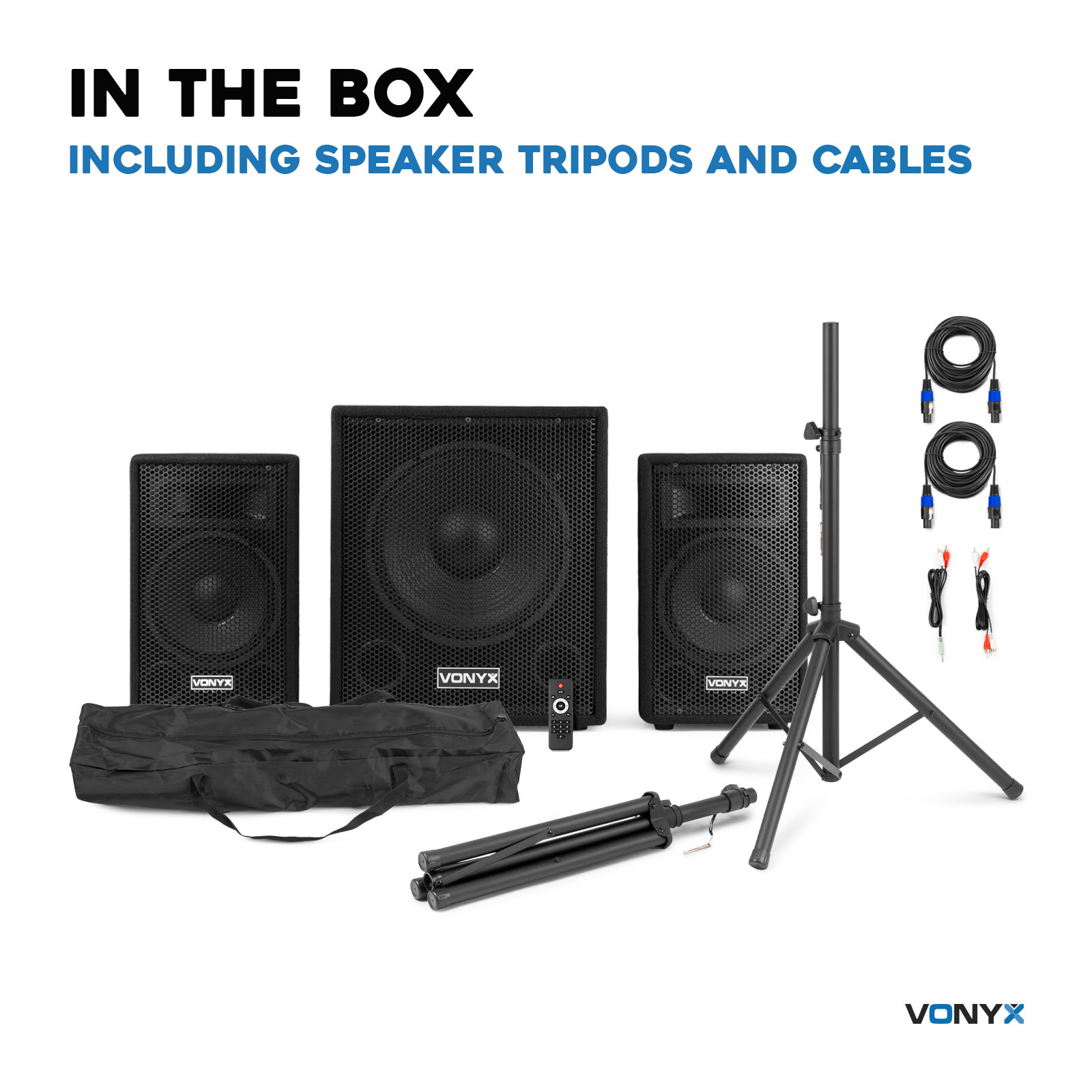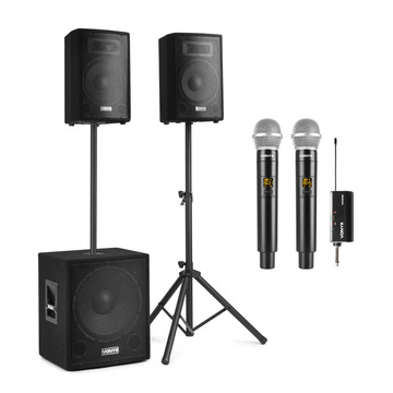 The VX1015BT is a powerful plug & play speaker set, delivering crystal clear dynamic audio in combination with a powerful bass. This compact set is easy to set-up and easy to transport. It includes a 15'' subwoofer and two 10'' satellite speakers with Piëzo high drivers . The built-in BT receiver allows you to simply stream your music wirelessly from your smartphone or you can use the built-in MP3 player with USB and SD slots. This active speaker set is suitable for mobile DJs, karaoke shows, drive-in shows, presentations etcetera.
