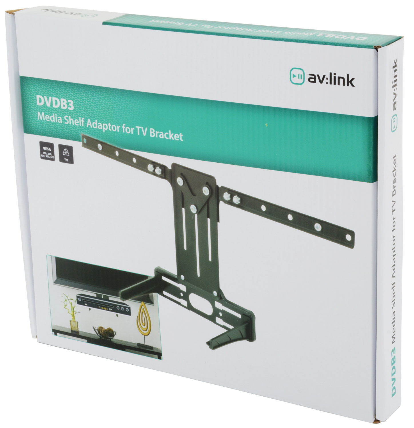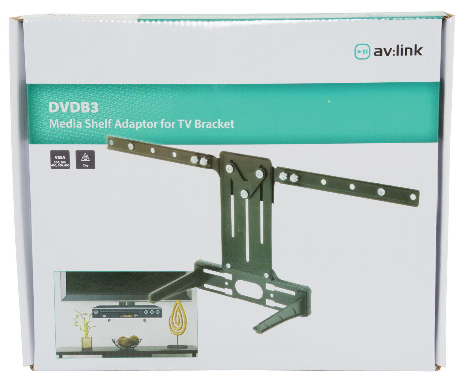 A VESA compatible attachment for mounting onto an existing TV bracket to allow a media box to be supported directly beneath a TV. Eliminates the need for additional drilling.